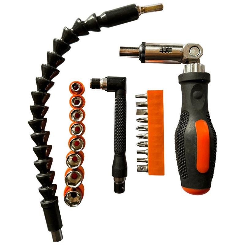 углеродистая сталь/пластмасса, в наборе отвертка реверсивная с шарниром , биты 25мм 9 шт (PH1, PH2 , PZ1, PZ2, SL4, SL5, SL6, T15, T20 ), торцевые головки 8 шт (5мм, 6мм, 7мм, 8мм, 9мм, 10мм, 11мм, 12мм ), адаптер 1/4 , адаптер угловой для бит, гибкий удлинитель для бит
