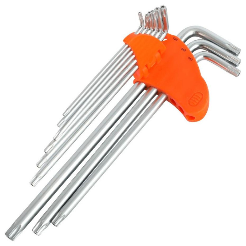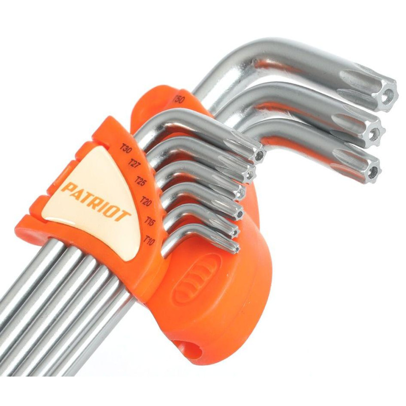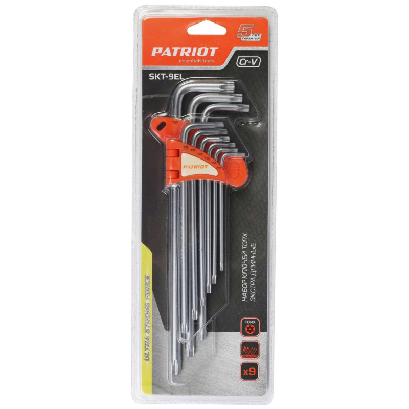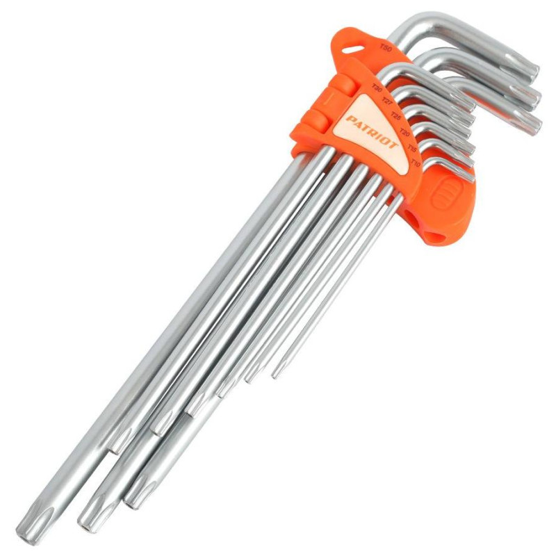 Комплект ключей PATRIOT SKT-9 EL включает в себя девять двухсторонних шестигранных ключей экстра-длины, сделанных из хромованадиевой стали с антикоррозийным покрытием. Виды ключей в наборе: Т10, Т15, Т20, Т25, Т27, Т30, Т40, Т45, Т50. Для хранения и переноски в комплекте идёт пластиковый держатель.