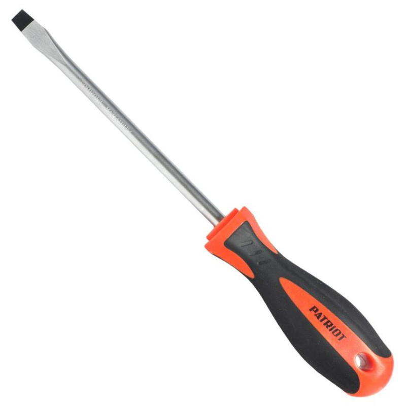 Отвертка плоская PATRIOT SL8x150. Стержень инструмента с магнитным наконечником выполнен из крепкой хромованадиевой стали. Эргономичная двухкомпонентная рукоять не скользит в руках.