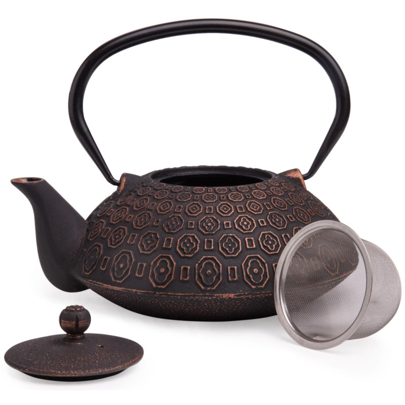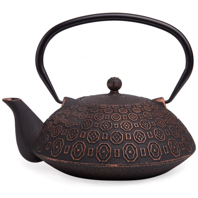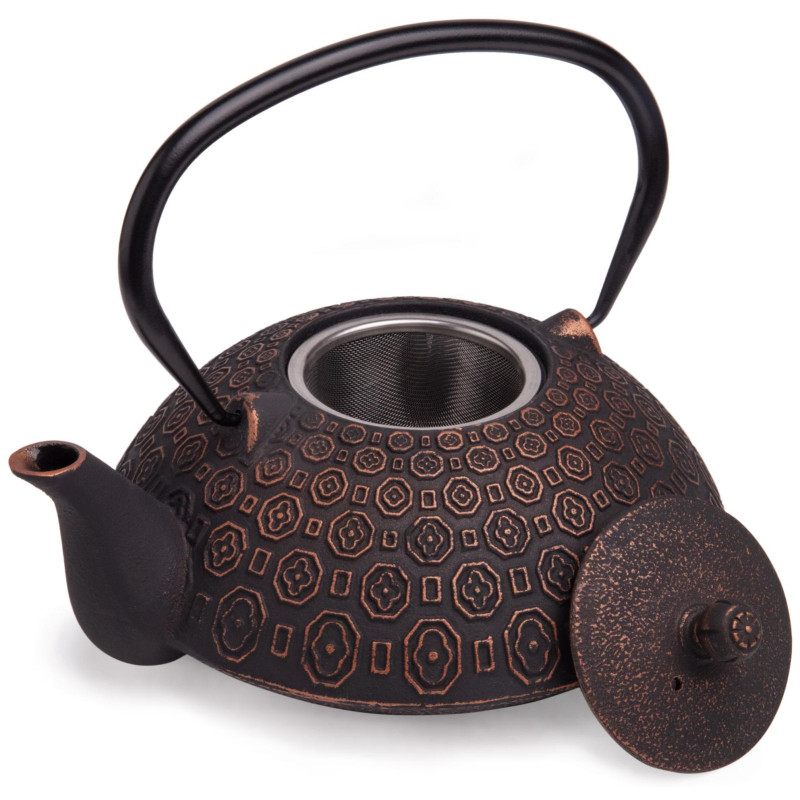 Устройте себе настоящую чайную церемонию с традиционным чугунным заварочным чайником. Внутренняя поверхность чайника покрыта эмалью, которая надежно защищает чайник от ржавчины и препятствует возникновению металлического привкуса у напитка, в связи с чем чайник идеально подойдет для заваривания Вашего любимого пуэра, улуна, черного, травяного или ароматизированного чая, раскрывая всю полноту вкуса напитка. В комплекте идет ситечко, которое надежно удерживает заварку. Не смотря на свои маленькие компактные размеры, этот чайник вмещает в себя 1200 мл, а его презентабельный внешний вид будет выигрышно смотреться на любом празднике.
