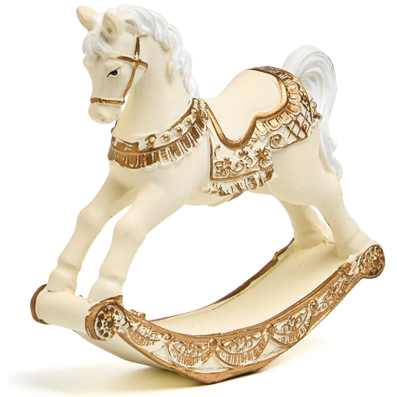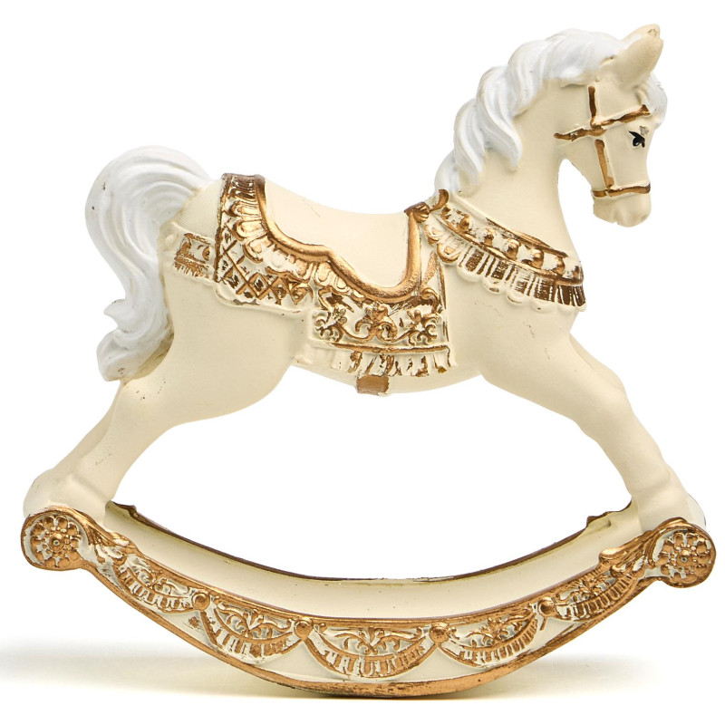 Пусть ваш дом наполнится нежностью и воспоминаниями — с этой изысканной статуэткой коня-качалки из прочного и благородного полистоуна! Он словно вышел из старинного дворца или винтажной игрушечной лавки: белоснежный, с пышной гривой и хвостом, украшенный золотыми узорами на седле, уздечке и дугах качалки — каждая деталь продумана до мелочей, чтобы вызывать улыбку и тёплые чувства.