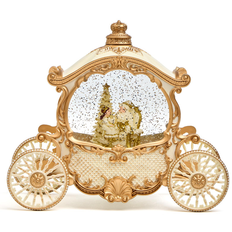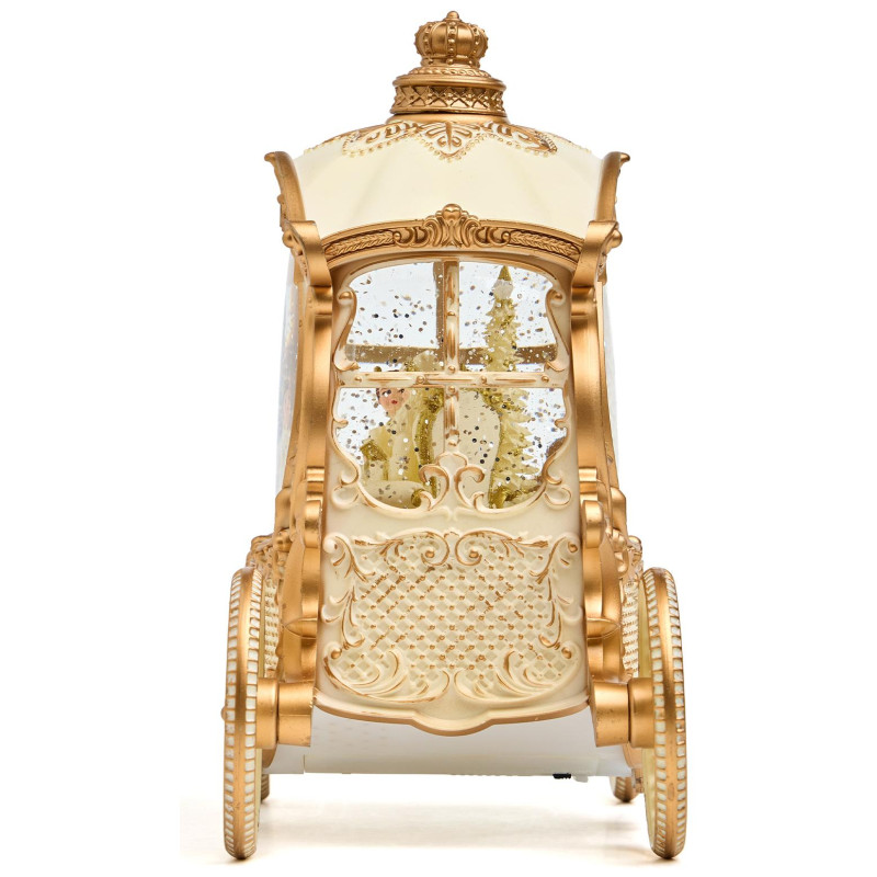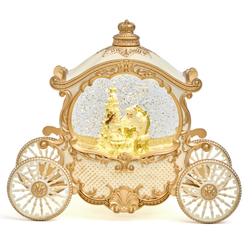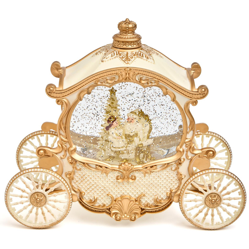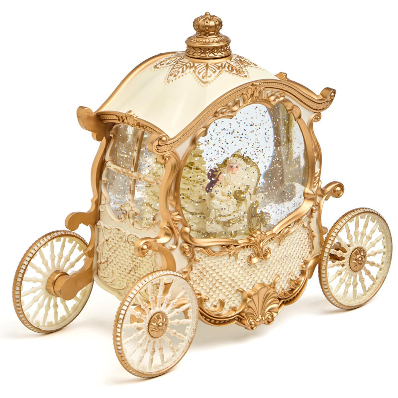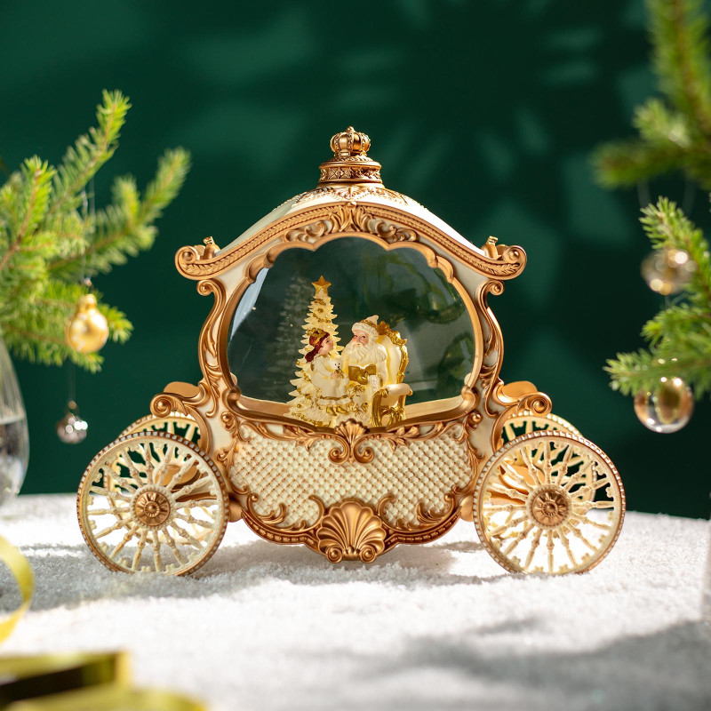 Пусть ваш дом наполнится сказочным волшебством — с этой очаровательной музыкальной каретой из прочного и благородного полистоуна! Она словно вышла прямо из сказки о Золушке: роскошные золотые узоры, изящные колёса, кружевная решётка и прозрачный купол, внутри которого — миниатюрная зимняя сцена с ёлкой и фигурами, окутанная мерцающим сверканием, как будто идёт снежная метель.