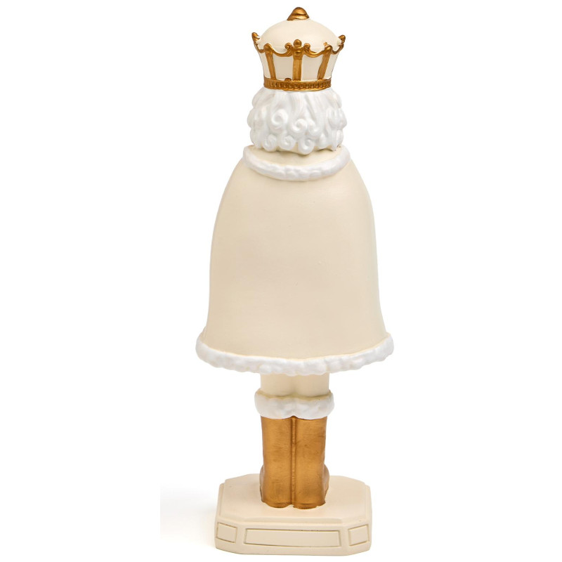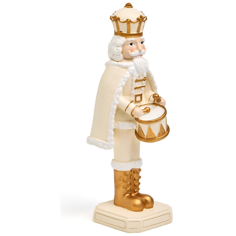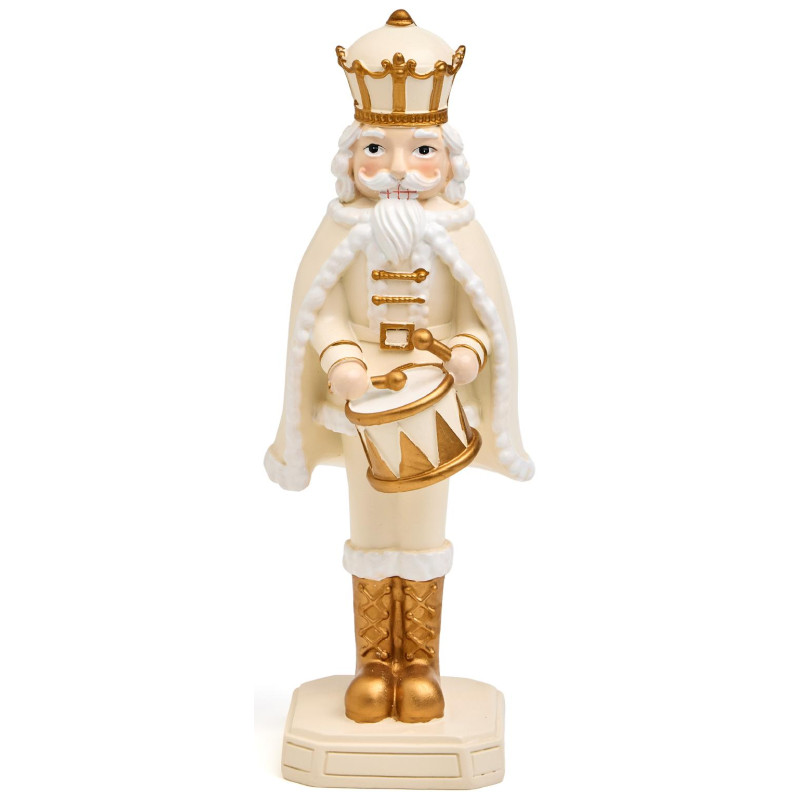 Пусть ваш дом наполнится волшебством — с этим величественным Щелкунчиком из прочного и благородного полистоуна! Он словно только что вышел из знаменитой балетной сказки: в короне, с пышным белым плащом, золотыми сапогами и барабаном в руках — он готов стать центром вашего новогоднего декора или любимым акцентом на камине, полке или рядом с ёлкой.
