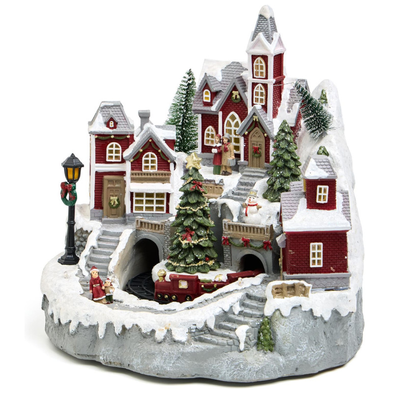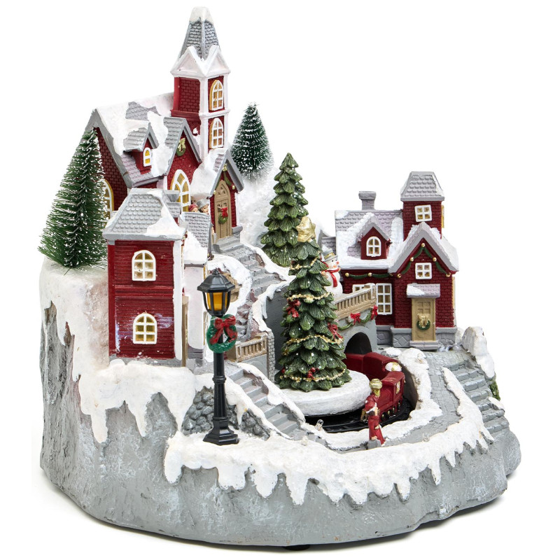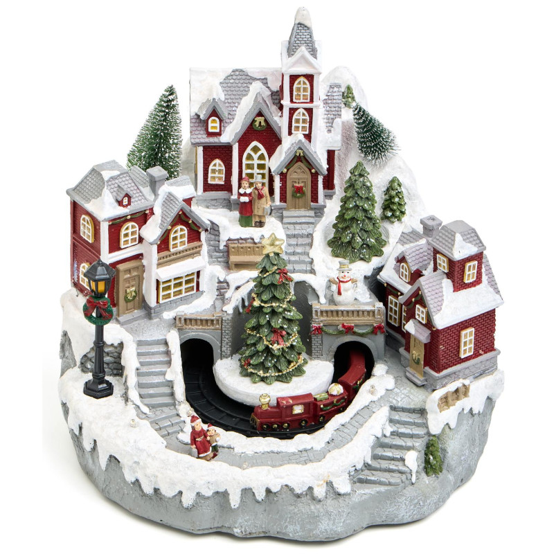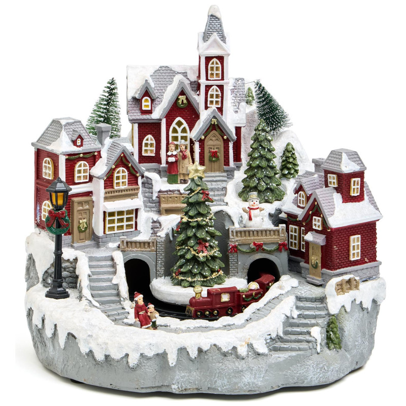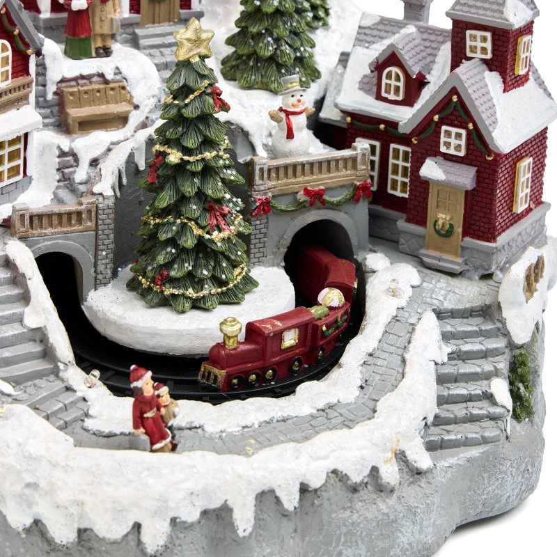 - Движущийся красный поезд, который плавно катится по кругу, проезжая сквозь туннели, словно развозя подарки по всему городку;