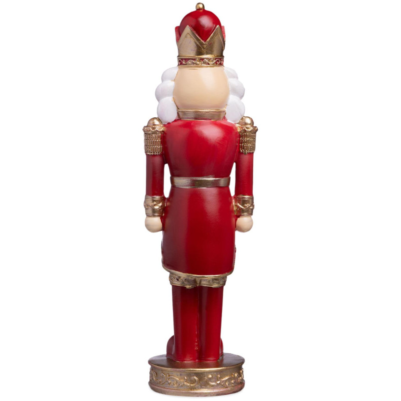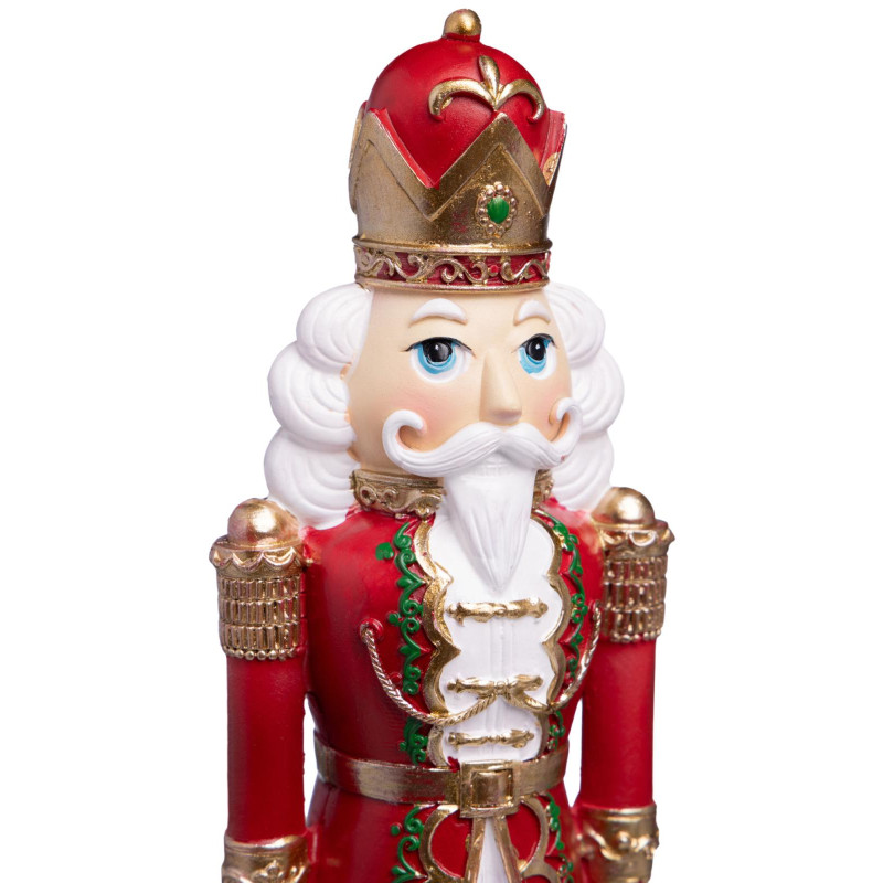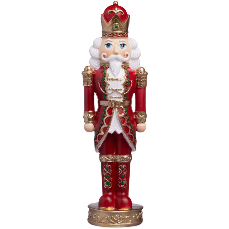 Яркий, торжественный, с короной и пышными золотыми узорами — этот Щелкунчик не просто статуэтка, а настоящий герой новогодней сказки. Изготовлен из прочного полистоуна: лёгкий, но выразительный, с глубоким красным цветом, белым мехом и золотыми деталями, словно сошедшими с рождественской открытки.