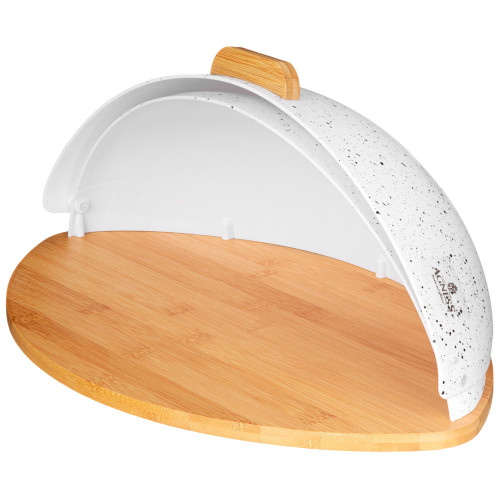 Хлебница имеет деревянное основание, на котором можно сразу нарезать хлеб.