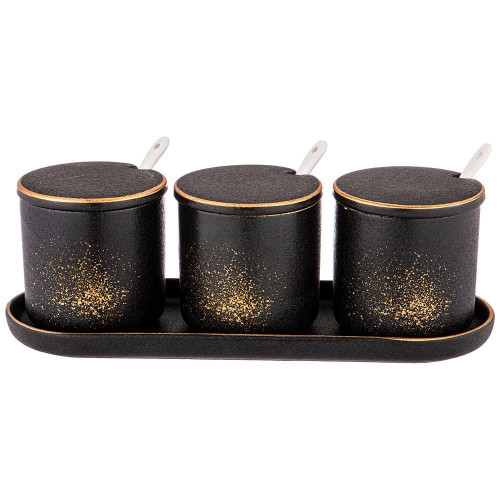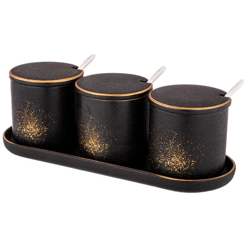 Коллекция "MIDNIGHT GOLD" ТМ BRONCO - это ультрамодная сервировка стола. Черный с золотыми брызгами и окантовкой фарфор. Глубокое матовое покрытие. Каждый предмет коллекции уникален. Тарелки в виде форм для запекания, сковородок, чугунков, элементы поверхности гриль на дне изделий - все это делает Ваш стол неповторимым! Посуда прошла сертификацию. Безопасна для контакта с пищевыми продуктами. С осторожностью использовать изделия в посудомоечной машине и микроволновой печи по причине возможного повреждения золотого декоративного покрытия. Рекомендуется применять мягкие средства для мытья в посудомоечной машине. Комплектность: банка с крышкой и ложкой 8*8 см 250 мл - 3 шт, подставка фарфоровая 27,5*9,5*2 см - 1 шт.