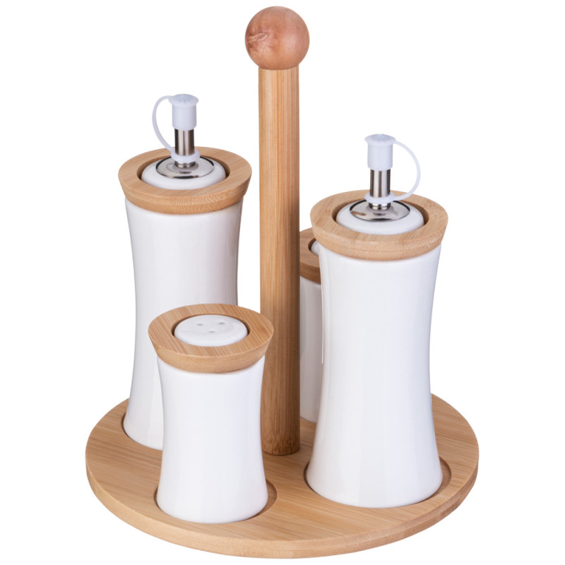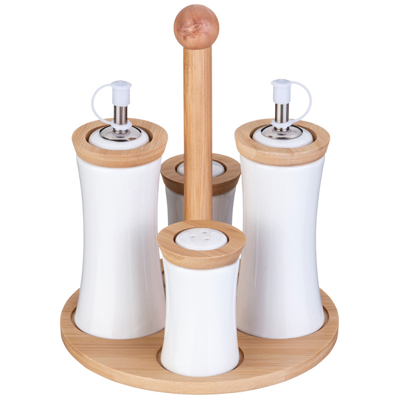 Комлектность: солонка - 1 шт., перечница - 1 шт., бутылка для масла/уксуса/соуса - 2 шт, деревянная подставка 18*18*22 см.