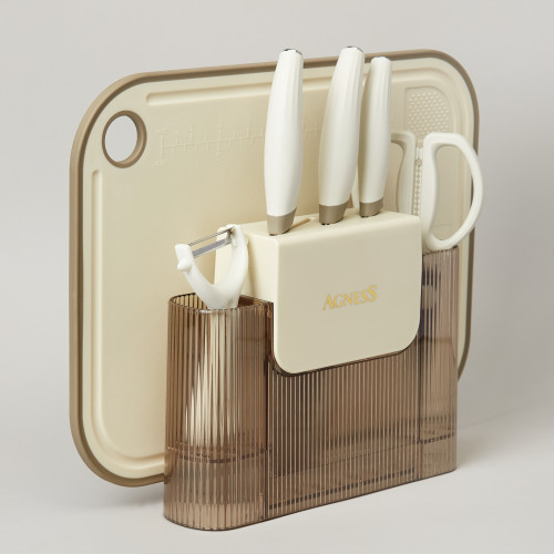 Нож - главный инструмент на кухне, а вернее ножи, т.к. даже самый лучший нож не сможет справиться со всем многообразием задач. Выбирая набор кухонных предметов AGNESS - Вы приобретаете комплект самых необходимых и чаще всего используемых ножей, ножницы разделочную доску и тёрку.