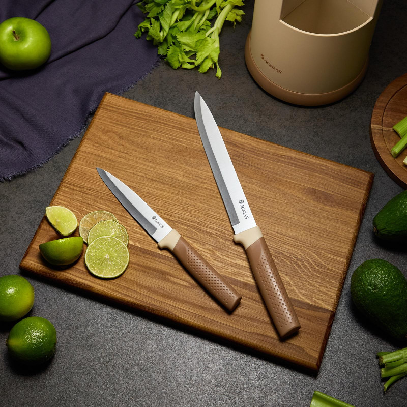 Состав набора: шеф нож 33см, нож для хлеба 33см, универсальный нож 33см, нож для офощей и фруктов 24см, нож для очистки овощей 20см, половник 31,5см, шумовка 32,3см, лопатка 32см, подставка 16,3х23,8см