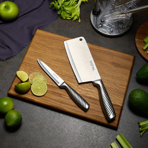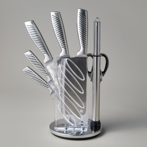 ● Состав набора: Топорик 17см, Нож поварской 20см, Нож для нарезки 20см, Нож универсальный 12, 5см, Нож для чистки овощей и фруктов, 9см, Мусат, Ножницы для птицы, Складывающаяся подставка.