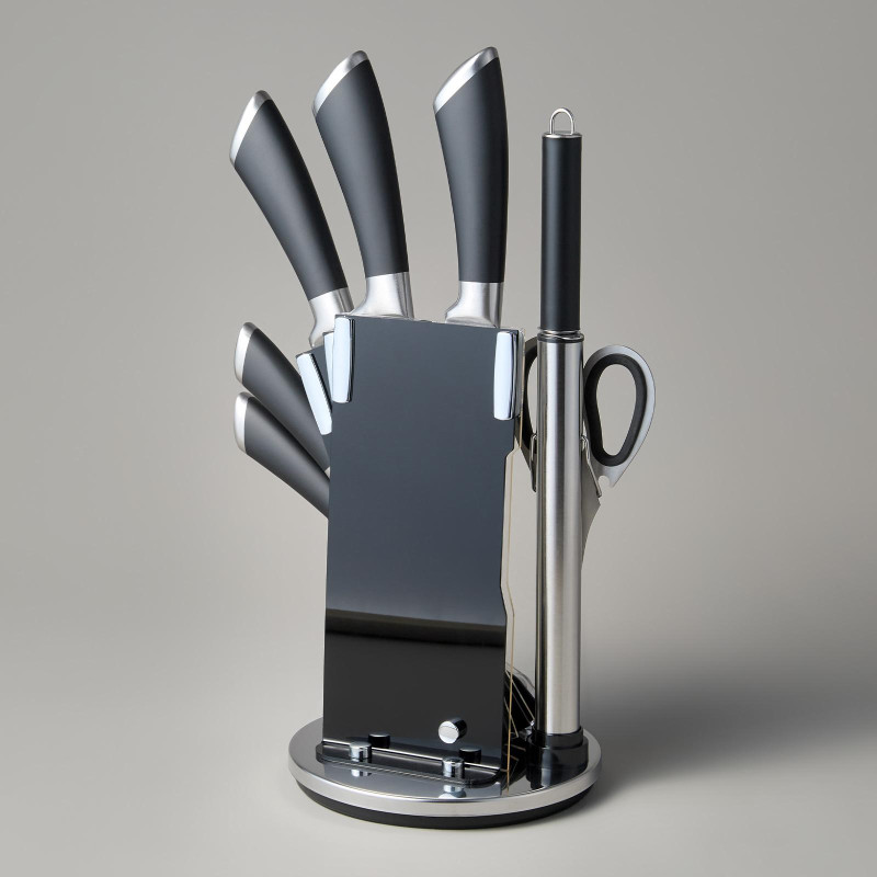 ● Состав набора: Топорик 17см, Нож поварской 20см, Нож для нарезки 20см, Нож универсальный 12, 5см, Нож для чистки овощей и фруктов, 9см, Мусат, Ножницы для птицы, Складывающаяся подставка.