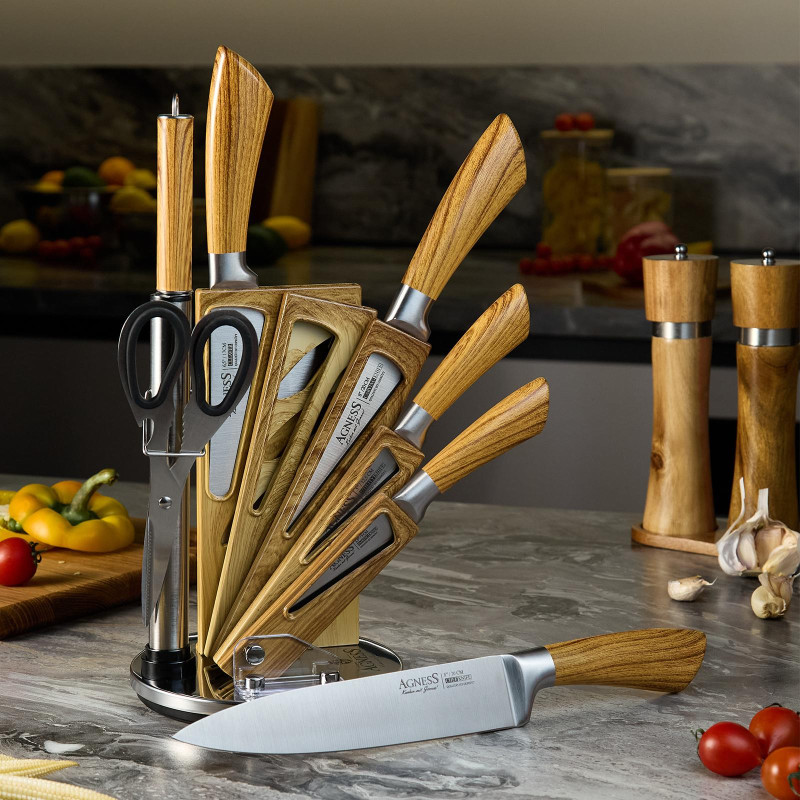 ● Состав набора: Топорик 17см, Нож поварской 20см, Нож для нарезки 20см, Нож универсальный 12, 5см, Нож для чистки овощей и фруктов, 9см, Муссат, Ножницы, Складывающаяся вращающаяся пластиковая подставка для безопасного хранения ножей.