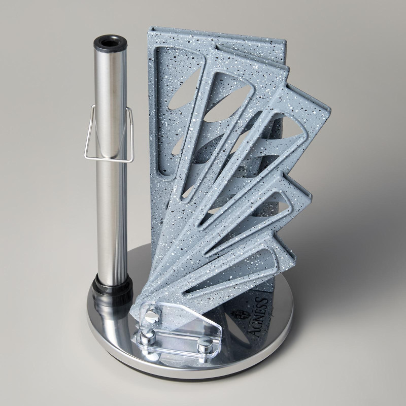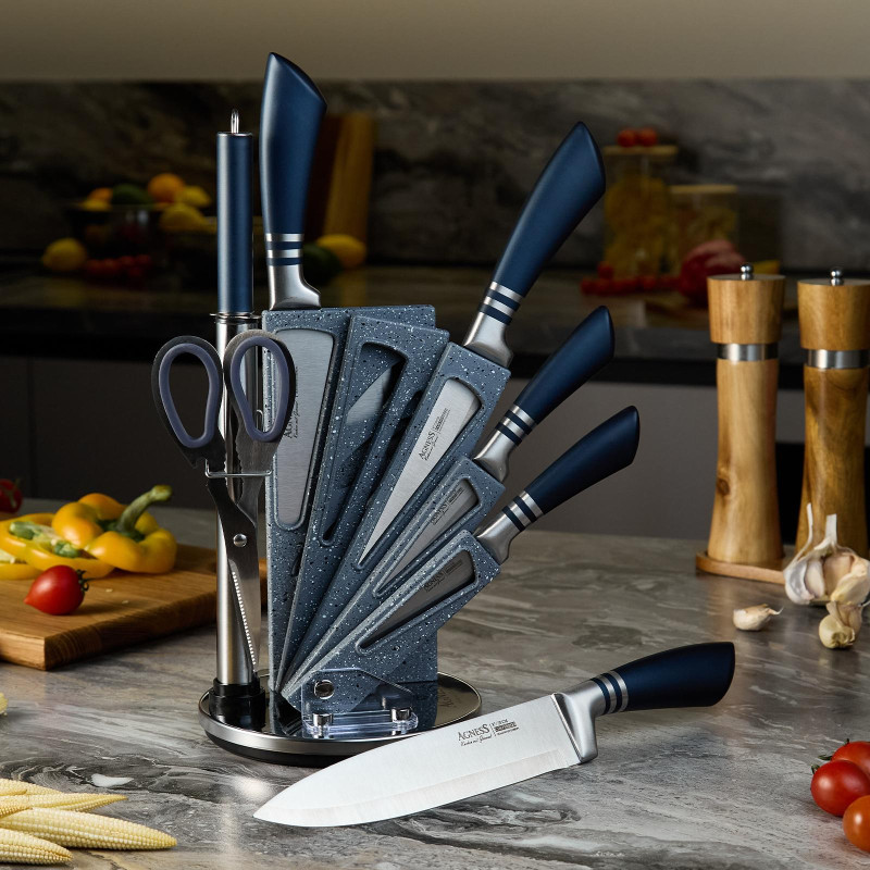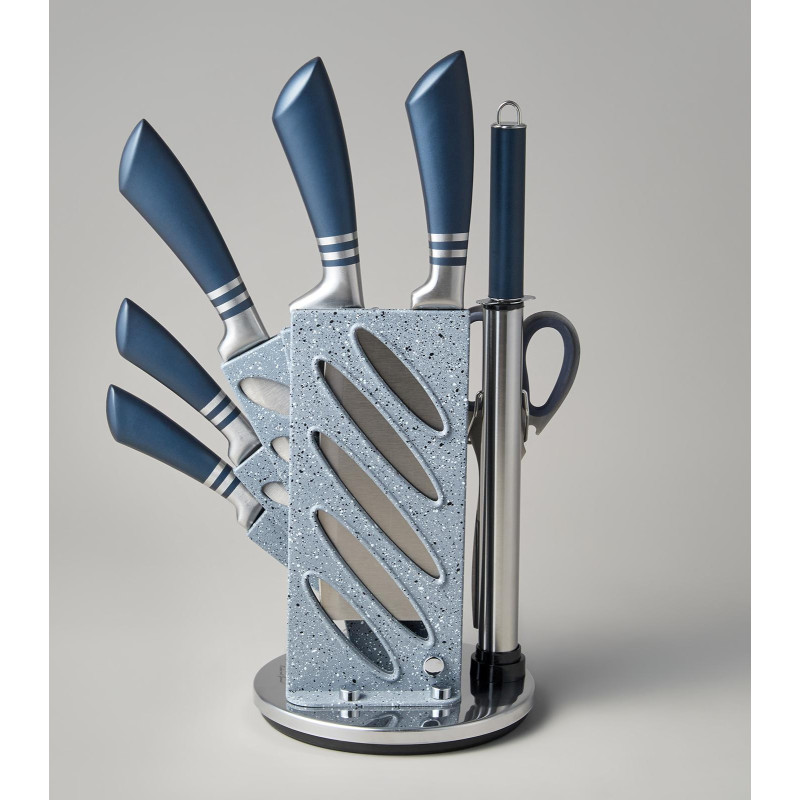 ● Состав набора: Топорик 17см, Нож поварской 20см, Нож для нарезки 20см, Нож универсальный 12, 5см, Нож для чистки овощей и фруктов, 9см, Муссат, Ножницы, Складывающаяся вращающаяся пластиковая подставка для безопасного хранения ножей.