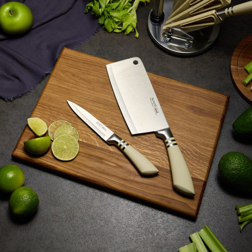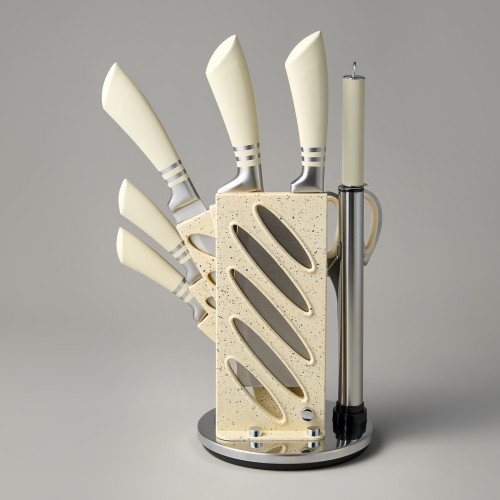 ● Состав набора: Топорик 17см, Нож поварской 20см, Нож для нарезки 20см, Нож универсальный 12, 5см, Нож для чистки овощей и фруктов, 9см, Муссат, Ножницы, Складывающаяся вращающаяся пластиковая подставка для безопасного хранения ножей.