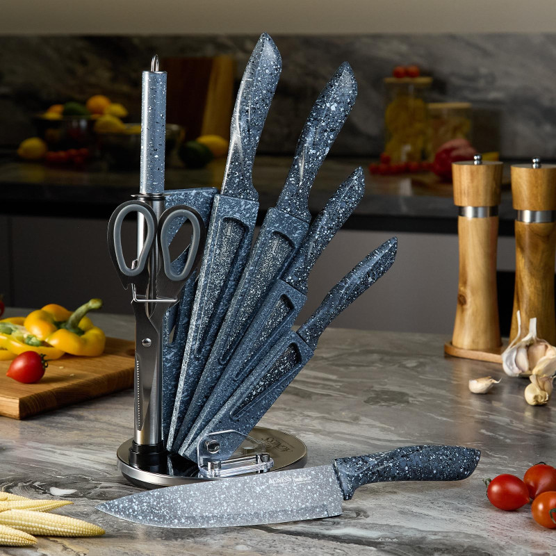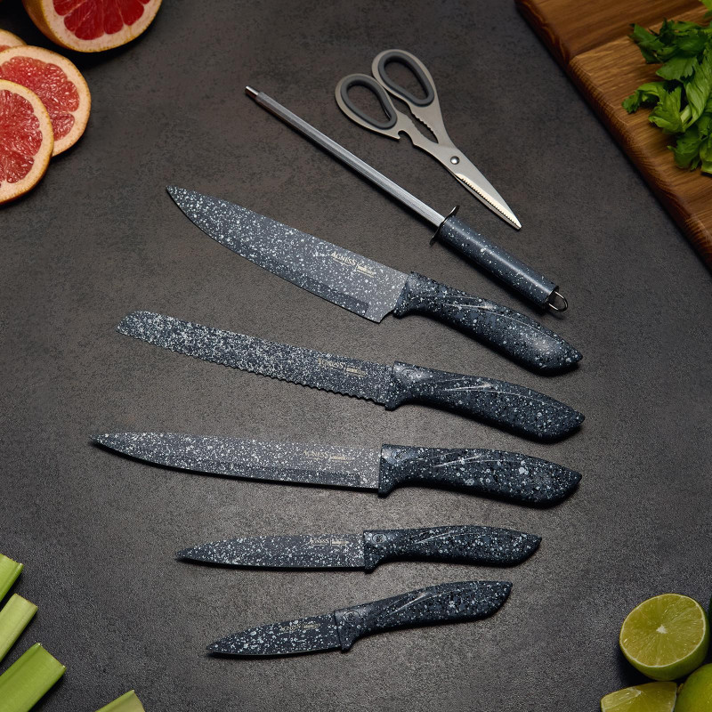 ● Состав набора: Нож поварской 20см, Нож для хлеба 20см, Нож для нарезки 20см, Нож универсальный 12,5см, Нож для чистки овощей и фруктов, 9см, Муссат, Ножницы, Пластиковая подставка для безопасного хранения ножей
