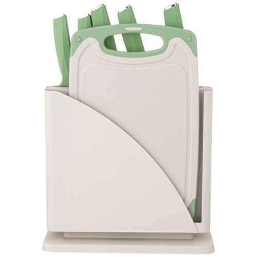 ● Состав набора: Нож поварской 20см, Нож для хлеба 20см, Нож для нарезки 20см, Нож универсальный 12,5см, Нож для чистки овощей и фруктов, 9см, Пластиковая разделочная доска, Пластиковая подставка для безопасного хранения ножей