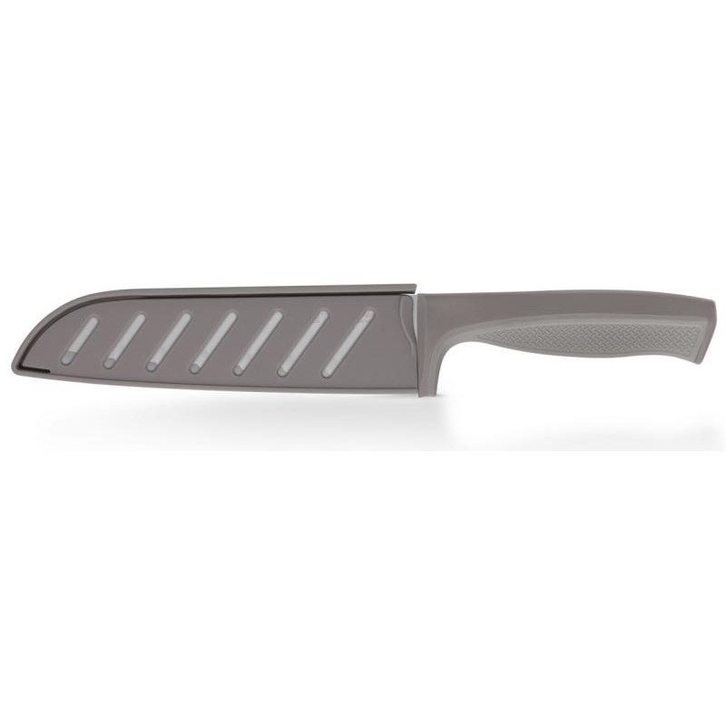 Сантоку, 17.5см, ширина лезвия 4.5мм, толщина 1.8мм, лезвие коррозионная сталь, коричневая рукоять пластик/силикон, в комплекте чехол из пластика, рекомендуется ручная мойка, упаковка картон и п/э пакет