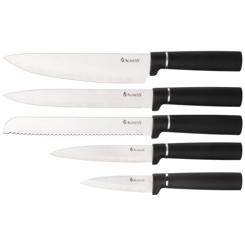 Состав набора: шеф-нож 20 см, нож для хлеба 20 см, универсальный нож 20 см, нож для овощей и фруктов 12, 5 см, нож для очистки овощей 8, 9 см, подставка 32, 2х10, 2х23, 2см, разделочная доска 4 шт./27, 5х21х0, 5см