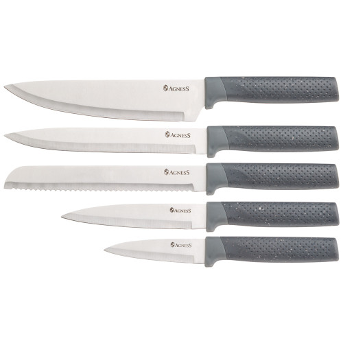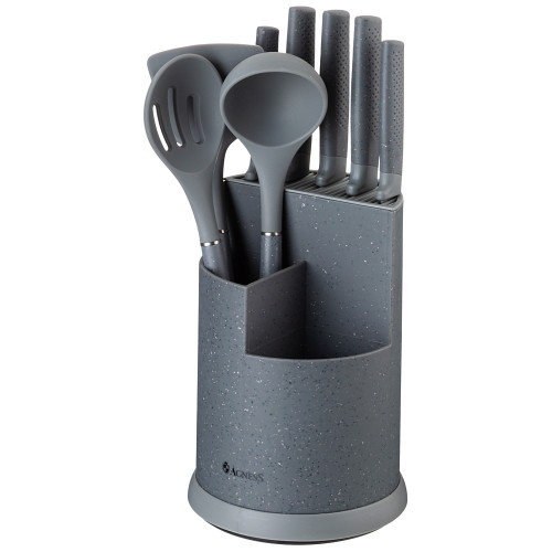 Набор из 9пр: 5 ножей, половник, лопатка и шумовка, вращающаяся подставка, цвет: серый AGNESS 671-205