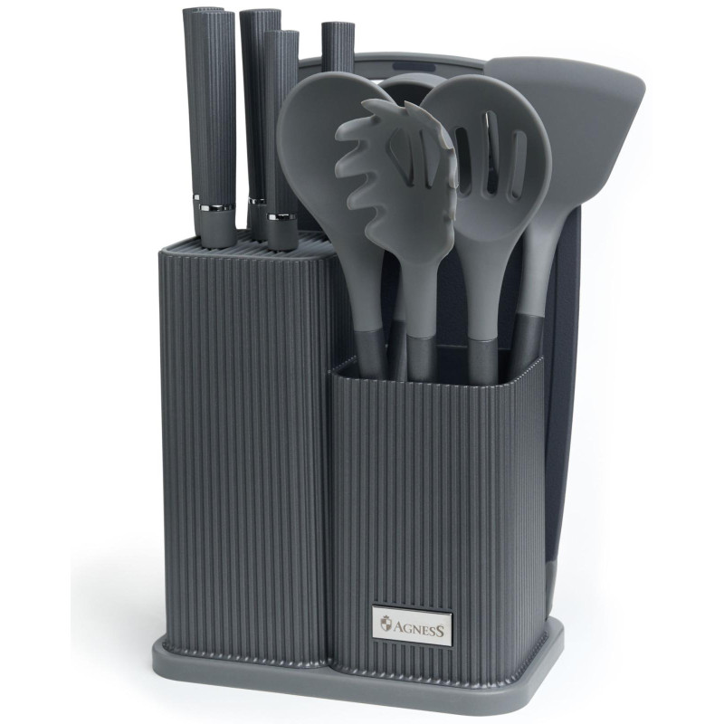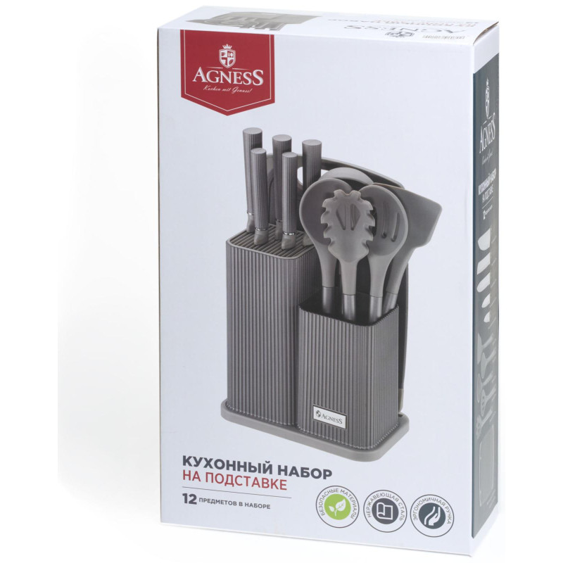 Набор из 12пр: 5 ножей, доска, подставка, половник, ложка, лопатка, шумовка, ложка для спагетти AGNESS 671-214