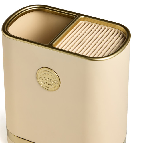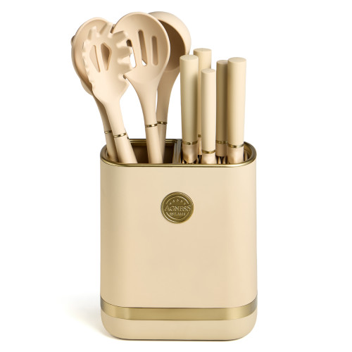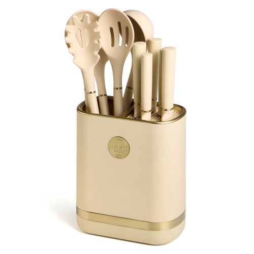Состав набора: шеф нож 19,5см, нож для хлеба 20см, нож разделочный 20см, универсальный нож 12,5см, нож для овощей и фруктов 8,9 см, половник 31,5см, шумовка 32,3см, лопатка 32см, ложка 32,3см, ложка для спагетти 32 см, подставка 23,8х16,3 см