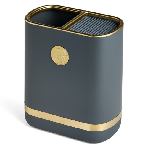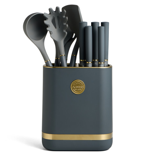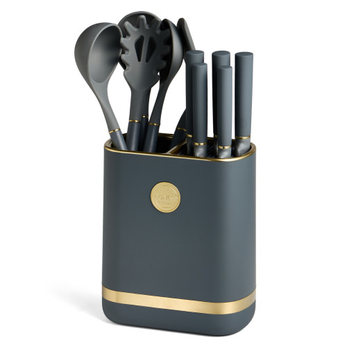 Состав набора: шеф нож 19,5см, нож для хлеба 20см, нож разделочный 20см, универсальный нож 12,5см, нож для овощей и фруктов 8,9 см, половник 31,5см, шумовка 32,3см, лопатка 32см, ложка 32,3см, ложка для спагетти 32 см, подставка 23,8х16,3 см