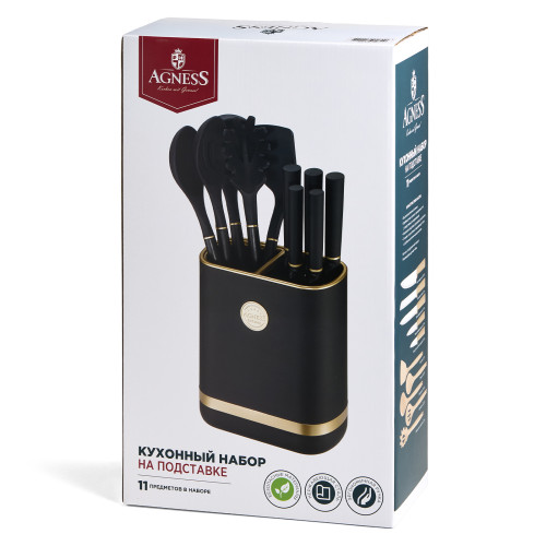 Набор из 11пр: 5 ножей, подставка, половник, ложка, лопатка, шумовка, ложка для спагетти AGNESS 671-222