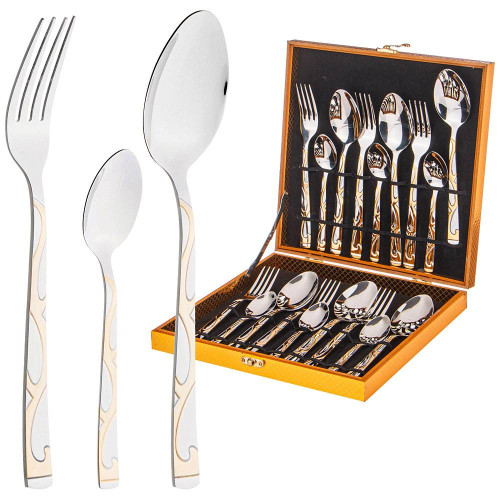 Набор состоиз из 18пр. - 6 столовых ложек, 6 столовых вилок, 6 чайных ложек. Набор идет в подарочном деревянном кейсе, который также подойдет для дальнейшего хранения столовый приборов.