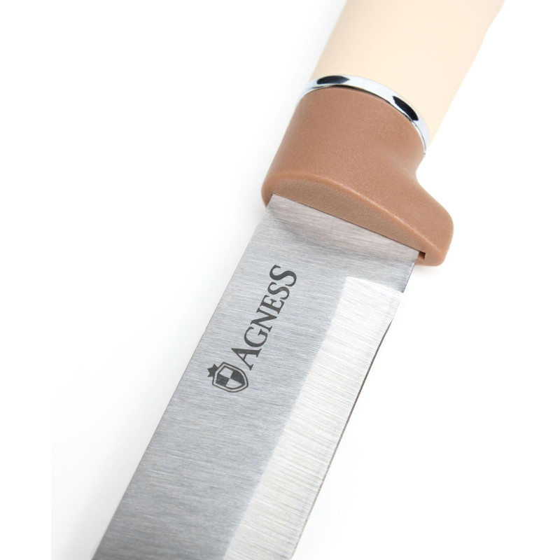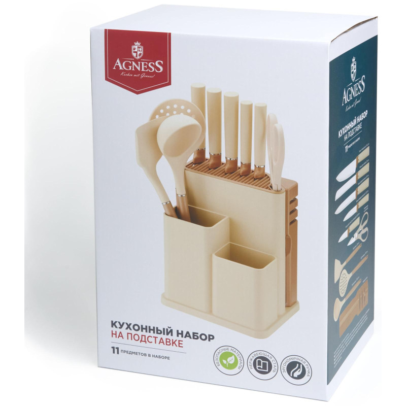 Набор из 11пр: 5 ножей, половник, лопатка, шумовка, подставка, ножеточка и ножницы, цвет: бежевый AGNESS 671-226