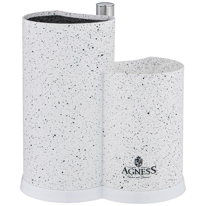 Подставка для ножей – необходимый аксессуар на каждой кухне. Подставка AGNESS с наполнителем и держателем для полотенец - это отличное решение для компактного хранения кухонных принадлежностей. Подставка легко и удобно решает проблему хранения ножей, защищая лезвия ножей от загрязнения. Дополнительный отсек можно использовать для хранения различных кухонных аксессуаров. Подставка для кухонных принадлежностей подходит для стандартных бумажных полотенец в рулонах.