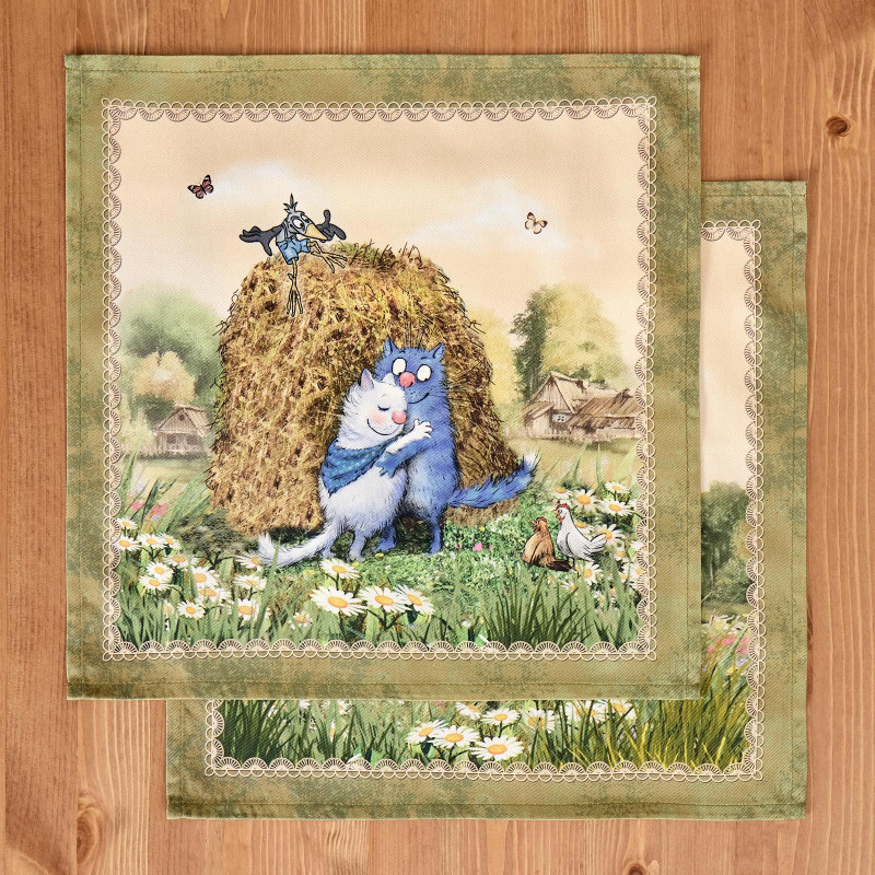Набор тканевых салфеток от бренда Лефард из серии "Синие коты.Про любовь" по мотивам иллюстраций Рины Зенюк. Этот комплект из двух квадратных салфеток станет отличным дополнением вашего интерьера. Они изготовлены из высококачественного 100% хлопка с саржевым переплетением Твил. Эта ткань не заламывается и не мнется, имеет высокую плотность, благодаря чему изделия из неё выглядят аккуратно и элегантно.