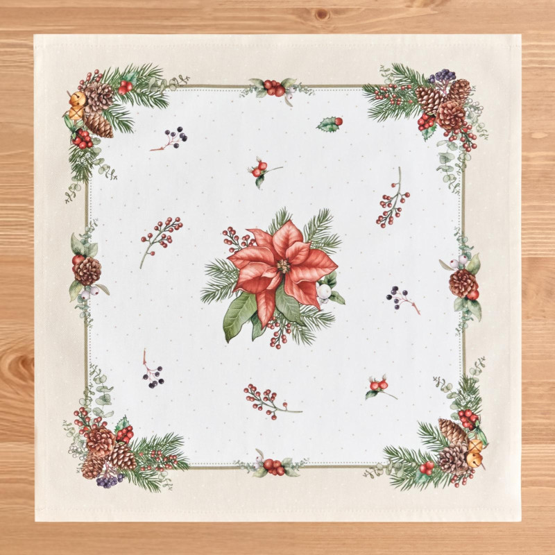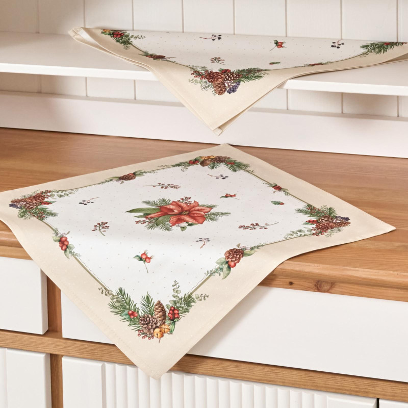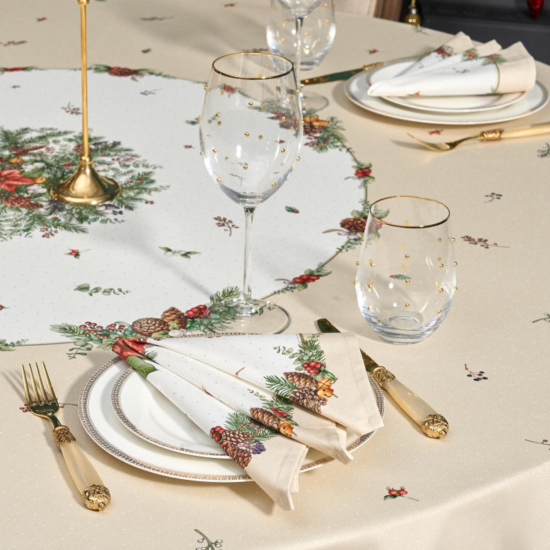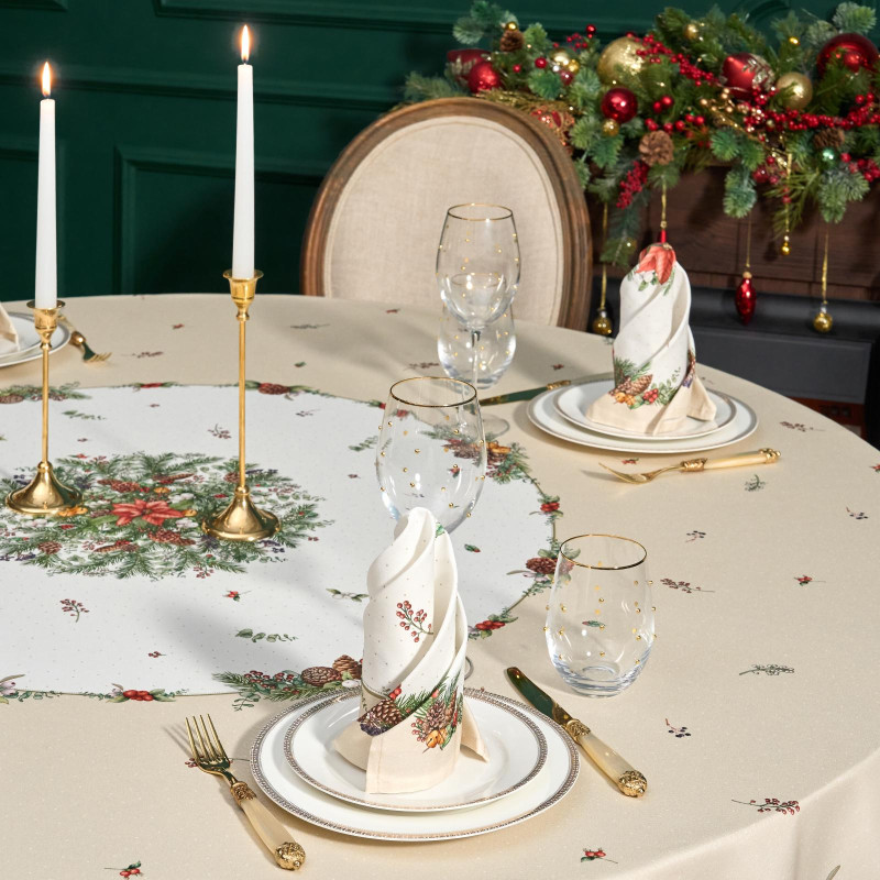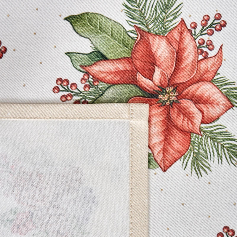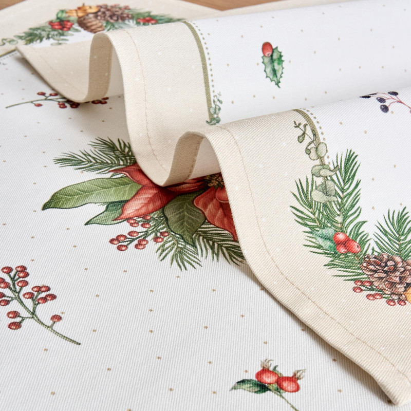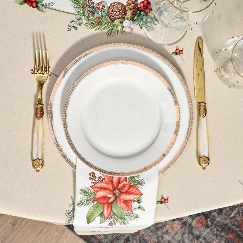 Рождественский принт с еловыми ветками, шишками, красными ягодами и пуансеттией (рождественским цветком) нанесён по технологии цифровой печати. Рисунок чёткий, яркий и долговечный, подчёркивает праздничное настроение и отлично сочетается с новогодней посудой и интерьером.