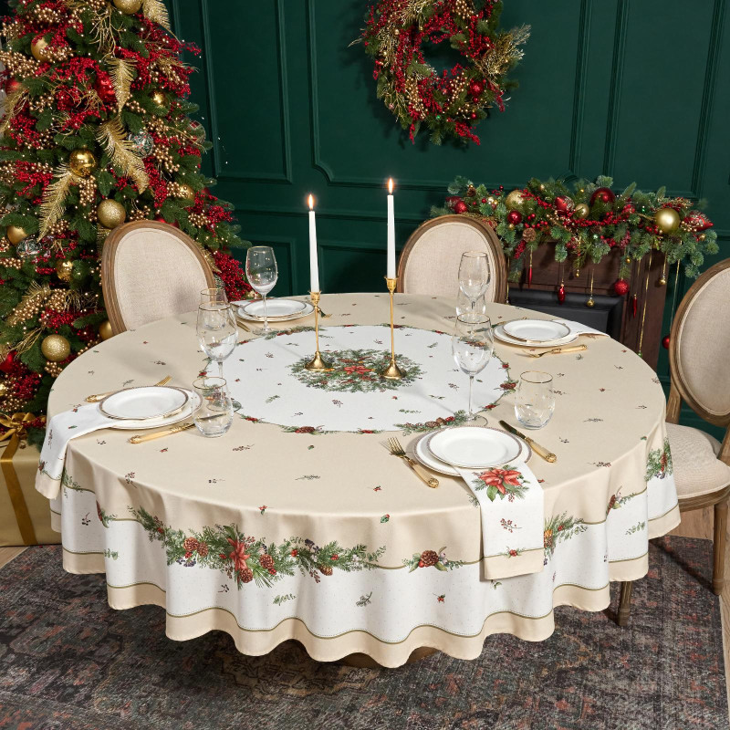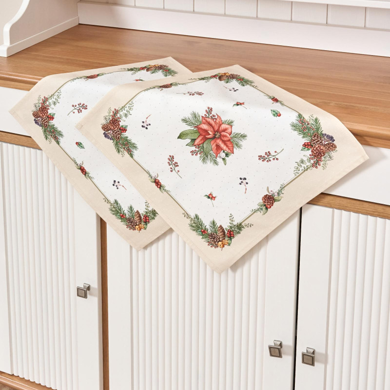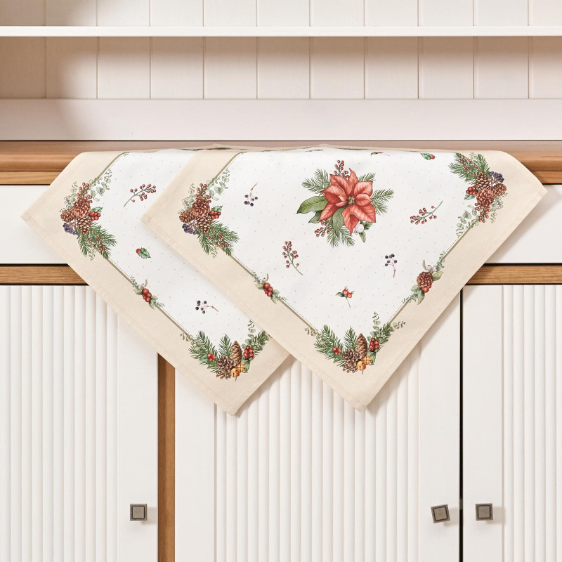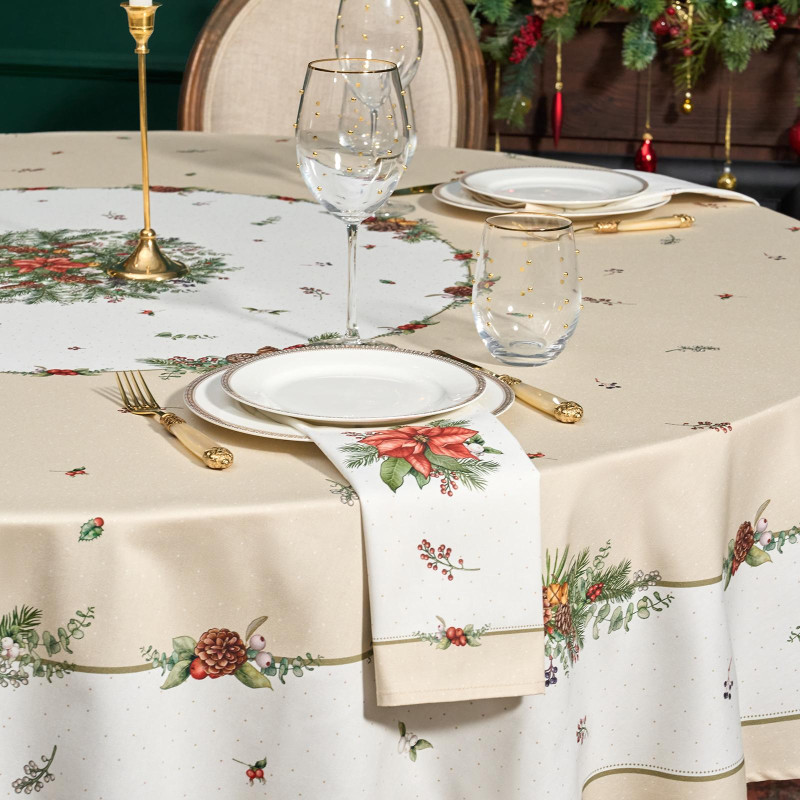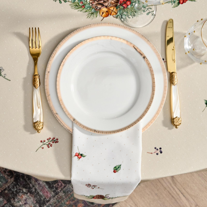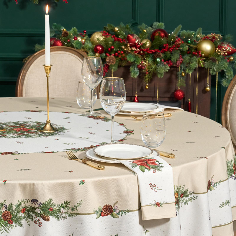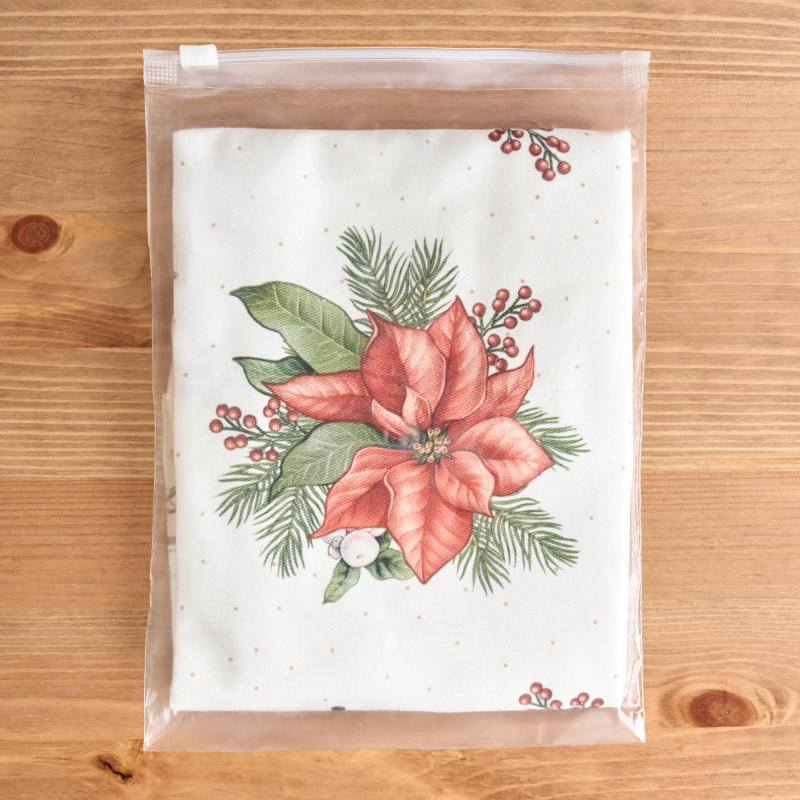Рождественский принт с еловыми ветками, шишками, красными ягодами и пуансеттией (рождественским цветком) нанесён по технологии цифровой печати. Рисунок чёткий, яркий и долговечный, подчёркивает праздничное настроение и отлично сочетается с новогодней посудой и интерьером.