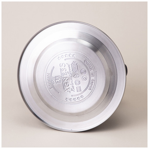Термоаккумулирующее дно ИМЕЕТ МНОГОСЛОЙНУЮ СТРУКТУРУ, в состав которой входит толстая пластина из алюминия, запрессованная под высоким давлением с металлическим диском, еще одной пластиной из алюминия, и эта конструкция закрывается капсулой из нержавеющей стали. Благодаря высокой теплопроводности алюминия термоаккумулирующее дно имеет свойства накапливать (аккумулировать) тепло и быстро и равномерно распределять его по всей поверхности посуды.
