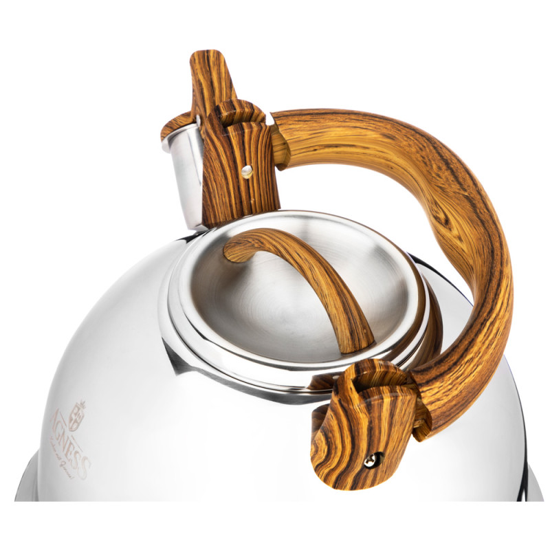 Благодаря пластиковой вставке чайник удобно переносить, а встроенный свисток подскажет, что вода в чайнике закипела и его пора снимать с плиты.