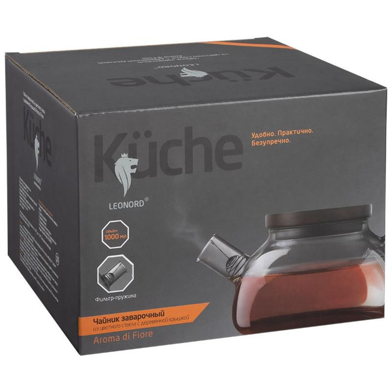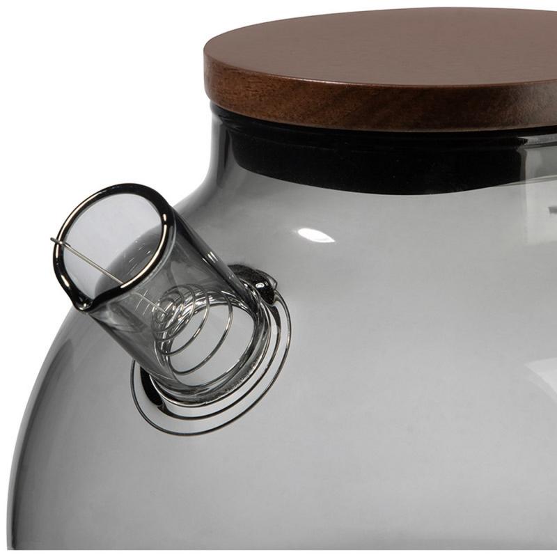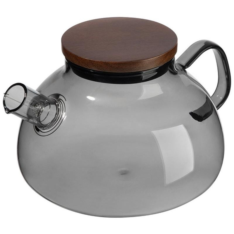 Чайник заварочный из цветного стекла, Aroma di Fiore, объём: 1л с тёмной ларикованной деревянной крышкой (дуб). боросиликатное стекло, цвет - чёрный.Фильтр-пружина на носике, выполнен из 304 нержавеющей стали. Крышка лакированное тёмное дерево (дуб)+силиконовая вставка (чёрная)+нержавеющая сталь.