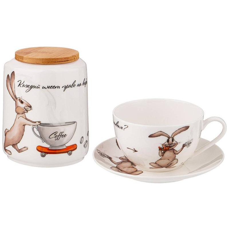 3 предмета, фарфор/дерево, кружка 300мл с блюдцем, банка с крышкой 600мл