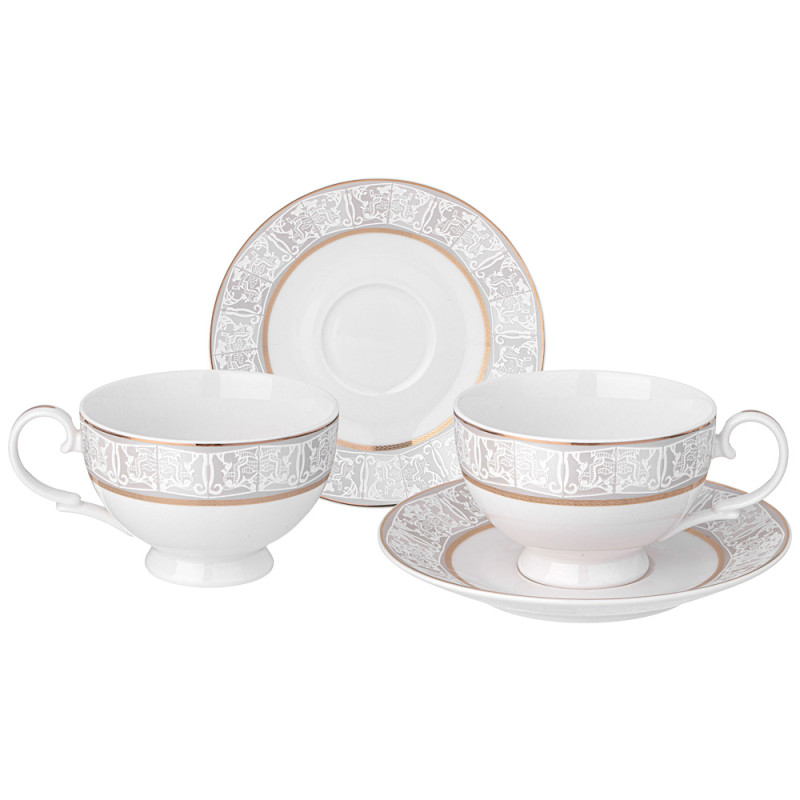 ТМ LEFARD Чайный набор "Свадебный" для торжественых застолий и семейных обедов. Изысканный фарфор Bone Pocelain с эффектом костяного фафора, тонкий и полупрозрачный, прочный и никогда не темнеет. Утонченный кружевной рельефный орнамент выглядит объемным и привлекательным благодаря различной обработке выпуклых и базовых поверхностей. Изящная золотая обводка придает блеск и торжественность. Эта посуда замечательный подарок на свадьбу, юбилей, день рождения, который наверняка пригодится каждой семье, запомнится навсегда и прослужит долгие годы. Дизайнеры торговой марки предлагают чайный и обеденный сервизы и наборы тарелок и чайных пар, чтобы сформировать полную сервировку стола предметами коллекции на 6 или 12 персон.