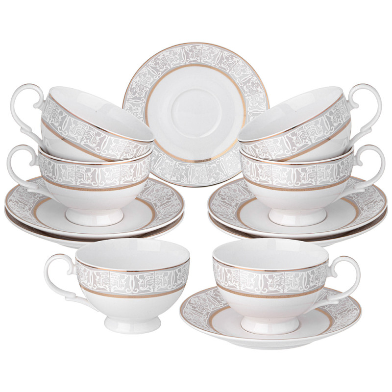 ТМ LEFARD Чайный набор "Свадебный" для торжественых застолий и семейных обедов. Изысканный фарфор Bone Pocelain с эффектом костяного фафора, тонкий и полупрозрачный, прочный и никогда не темнеет. Утонченный кружевной рельефный орнамент выглядит объемным и привлекательным благодаря различной обработке выпуклых и базовых поверхностей. Изящная золотая обводка придает блеск и торжественность. Эта посуда замечательный подарок на свадьбу, юбилей, день рождения, который наверняка пригодится каждой семье, запомнится навсегда и прослужит долгие годы. Дизайнеры торговой марки предлагают чайный и обеденный сервизы и наборы тарелок и чайных пар, чтобы сформировать полную сервировку стола предметами коллекции на 6 или 12 персон.
