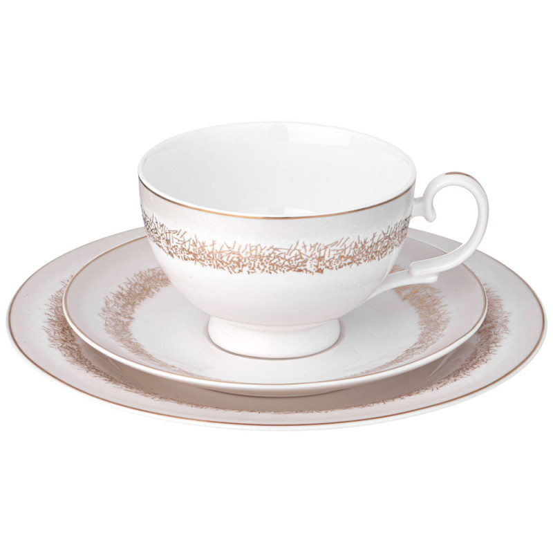 ТМ LEFARD Сервиз чайный "Золотой песок" для торжественного чаепития и семейных застолий. Изысканный фарфор Bone Pocelain с эффектом костяного фафора, тонкий и полупрозрачный, прочный и никогда не темнеет. Утонченный кружевной рельефный орнамент выглядит объемным и привлекательным благодаря различной обработке выпуклых и базовых поверхностей. Изящная золотая обводка придает блеск и торжественность. Эта посуда замечательный подарок на свадьбу, юбилей, день рождения, который наверняка пригодится каждой семье, запомнится навсегда и прослужит долгие годы. Дизайнеры торговой марки предлагают обеденный сервиз и наборы тарелок и чайных пар, чтобы сформировать полную сервировку стола предметами коллекции на 6 или 12 персон.