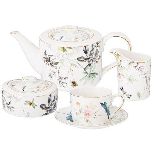 TM LEFARD коллекция "Стрекоза" - это уникальный и запоминающийся дизайн. Луговые цветы на фоне дневного прозрачно-белого неба - это летнее настроение на Вашей кухне круглый год. Удобные формы и качественный тонкостенный фарфор делают посуду коллекции "Стрекоза" прекрасным подарком к любому торжеству. Продукция прошла сертификацию и безопасна для контакта с пищевыми продуктами. Не использовать в микроволновой печи, не рекомендуется мыть в посудомоечной машине. Комплектность: чайник 900 мл, сахарница 300 мл, молочник 200 мл, 6 чашек 250 мл, 6 блюдец.