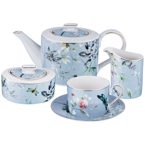 TM Lefard коллекция "Блоссом" - это уникальный и запоминающийся дизайн. Луговые цветы на фоне утреннего нежно-голубого неба - это летнее настроение на Вашей кухне круглый год. Удобные формы и качественный тонкостенный фарфор делают посуду коллекции "Стрекоза" прекрасным подарком к любому торжеству. Продукция прошла сертификацию и безопасна для контакта с пищевыми продуктами. Не использовать в микроволновой печи, не рекомендуется мыть в посудомоечной машине. Комплектность: чайник 900 мл, сахарница 300 мл, молочник 200 мл, 6 чашек 250 мл, 6 блюдец.