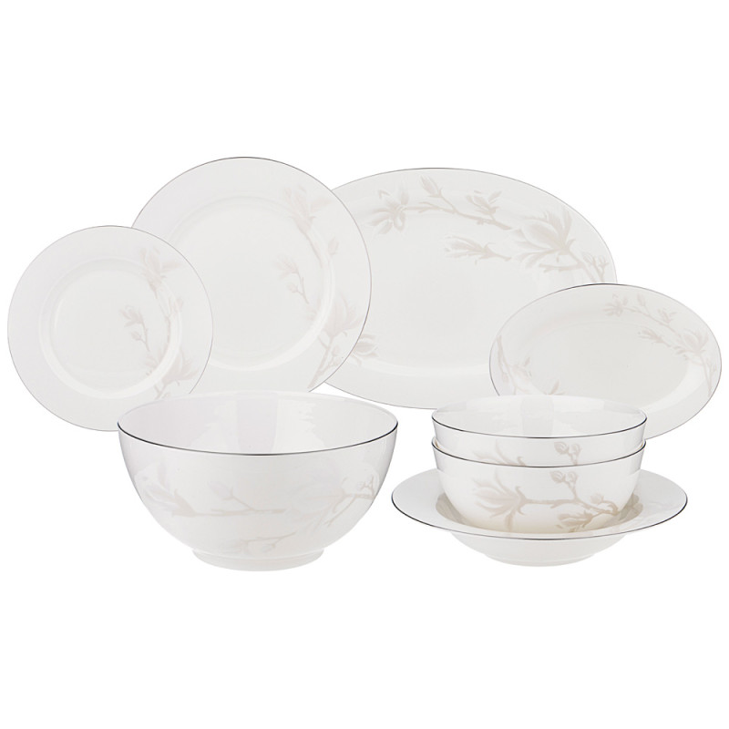 Комплектность: тарелка обеденная 25,5 см 6 шт., тарелка закусочная 20,5 см 6 шт., тарелка суповая 23 см 6 шт., салатник 23 см 1750 мл, салатник 16 см 750 мл 2 шт., блюдо овальное 36 см, блюдо овальное 23 см.