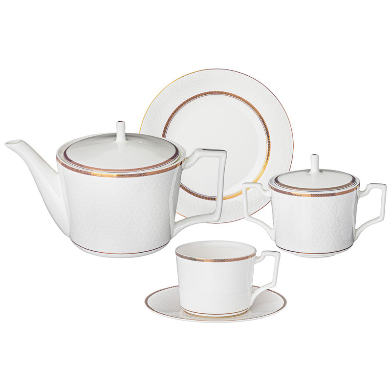 Комплектность: чайник 1000 мл - 1 шт., сахарница 300 мл - 1 шт., чашка 250 мл - 6 шт., блюдце 15,5 см - 6 шт., тарелка пирожковая 18 см - 6 шт.
