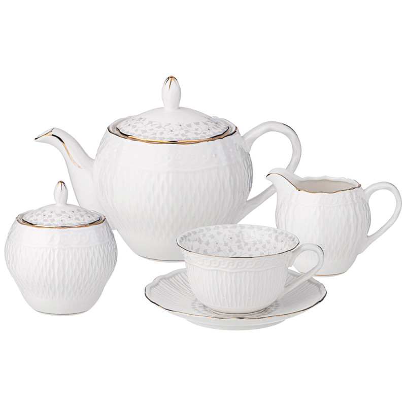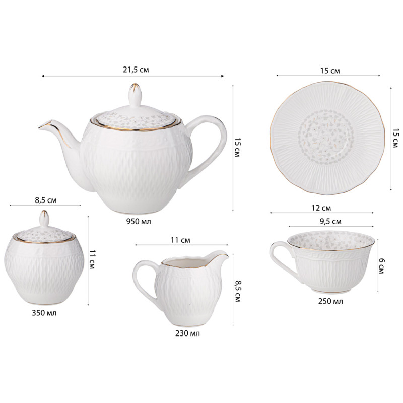 Комплектация: чайник 950 мл - 1 шт., сахарница 350 мл - 1 шт., молочник 230 мл - 1 шт., чашка 250 мл - 6 шт., блюдце 15 см - 6 шт.