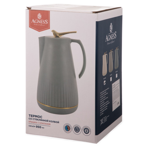 Наслаждайтесь легкостью работы, отдыха и жизни вместе с вашим любимым напитком! Стильный термос AGNESS с двойной стеклянной колбой — сочетает в себе функциональность и эстетику.Термос со стеклянной колбой поддерживает температуру, сохраняя напиток горячим на долгое время. Изысканный пластиковый корпус вокруг внутренней стеклянной колбы не только дополнительно сохраняет тепло, но и обеспечивает надежную защиту. Ручка-птичка и носик обеспечивают легкий доступ к напитку, делая использование термоcа максимально удобным. Герметичная крышка защищае напиток от протекания. Просто нажмите на ручку, чтобы налить напиток. Колба из стекла экологична и безопасна для здоровья, вода в ней не приобретает лишних привкусов. Привлекательный дизайн и современные расцветки делают термос AGNESS неотъемлемым элементом вашего стиля. Выбирайте качество, комфорт и стиль термосом AGNESS.Термос