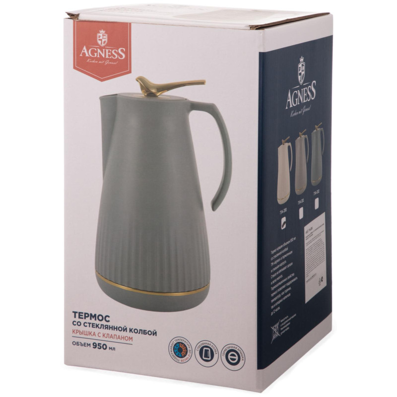 Наслаждайтесь легкостью работы, отдыха и жизни вместе с вашим любимым напитком! Стильный термос AGNESS с двойной стеклянной колбой — сочетает в себе функциональность и эстетику.Термос со стеклянной колбой поддерживает температуру, сохраняя напиток горячим на долгое время. Изысканный пластиковый корпус вокруг внутренней стеклянной колбы не только дополнительно сохраняет тепло, но и обеспечивает надежную защиту. Ручка-птичка и носик обеспечивают легкий доступ к напитку, делая использование термоcа максимально удобным. Герметичная крышка защищае напиток от протекания. Просто нажмите на ручку, чтобы налить напиток. Колба из стекла экологична и безопасна для здоровья, вода в ней не приобретает лишних привкусов. Привлекательный дизайн и современные расцветки делают термос AGNESS неотъемлемым элементом вашего стиля. Выбирайте качество, комфорт и стиль термосом AGNESS.Термос