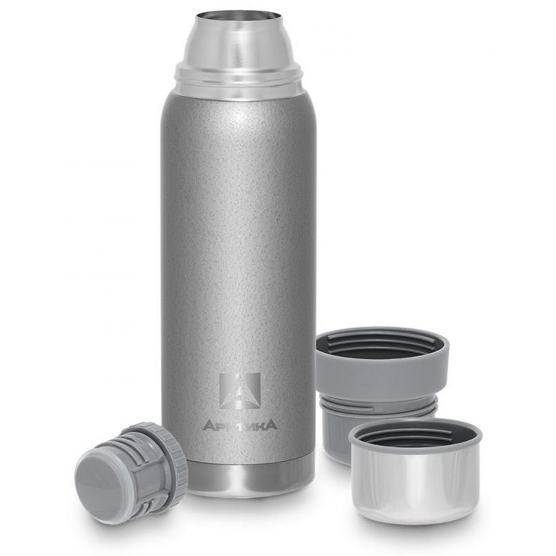 0.75л, с узким горлом и глухой пробкой, 2 накручивающиеся чашки в комплекте, молотковая эмаль на корпусе дополнительно защищает термос от сколов и царапин