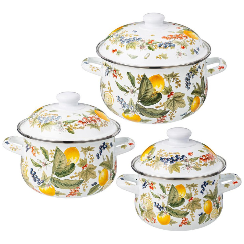 Набор кастрюль эмалированных серия " ФРУКТОВАЯ КОРЗИНА" , 6пр. 1, 5/2, 8/3, 6л, 16х10/20х12/22х13см AGNESS 934-707